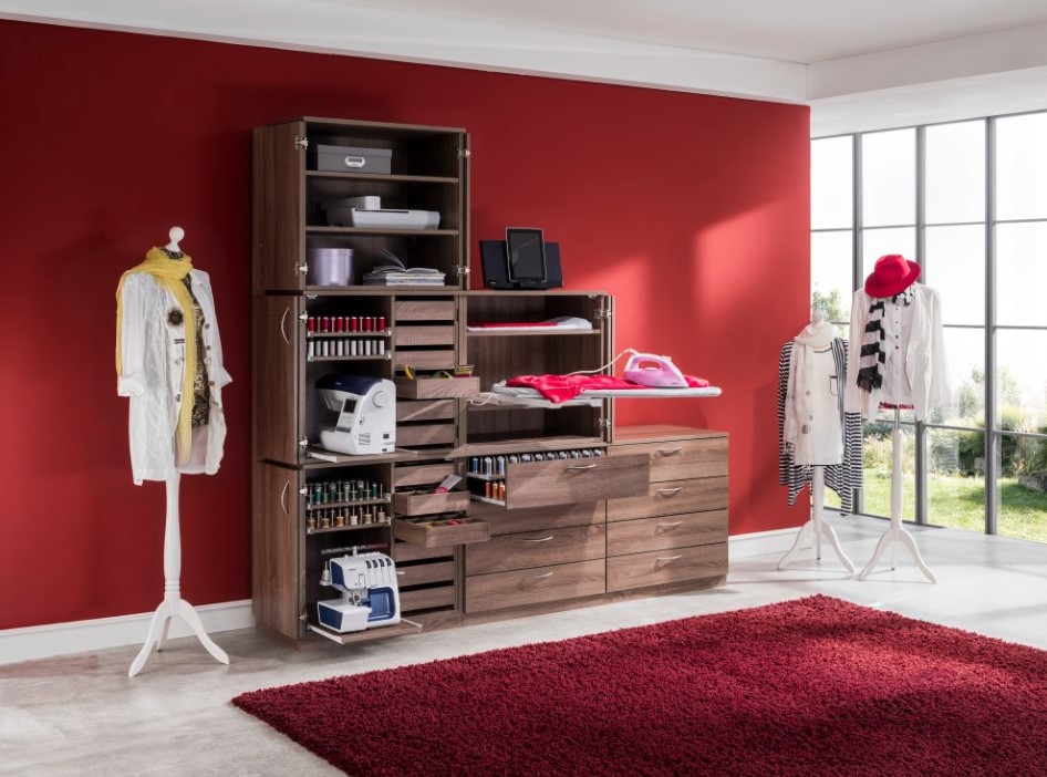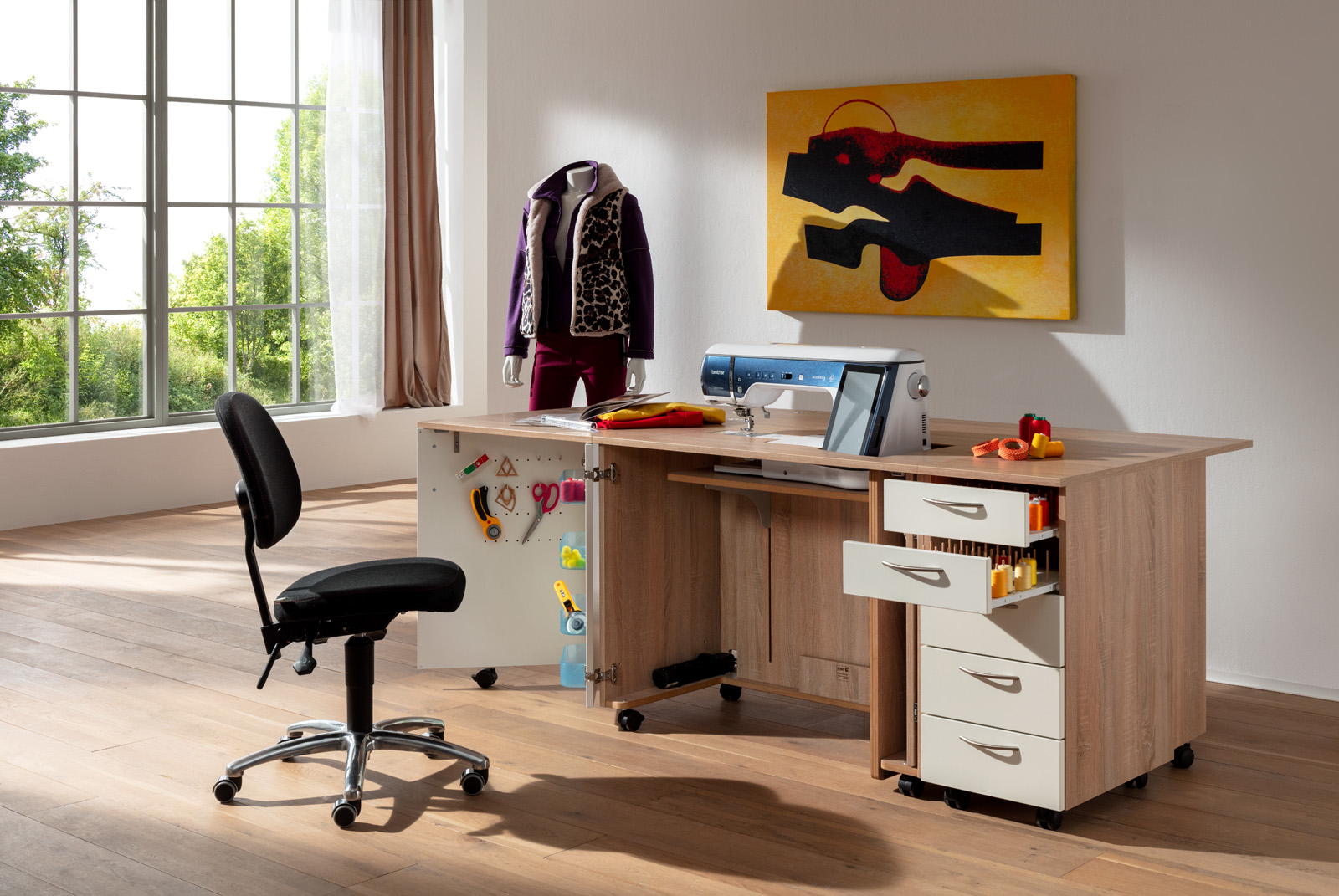 Take your creativity to the next level by designing the ideal sewing cabinet with our modular furniture. Our BASE, EXTEND & STACK series allows you to create the perfect sewing room with limitless possibilities. All modular machine furniture features our infill Simply-6 cut-out, it can be used with any type of sewing machine including the Brother Aveneer EV1, Bernina 990 & Pfaff Creative Icon 2. An electronic Easy-Softtech Lift provides fast repositioning, and an i-Touch control panel with two memory functions and a lock button provides simple up and down movement. Furthermore, the table is equipped with a four-way power strip, allowing connection of the sewing machine and other electronics.