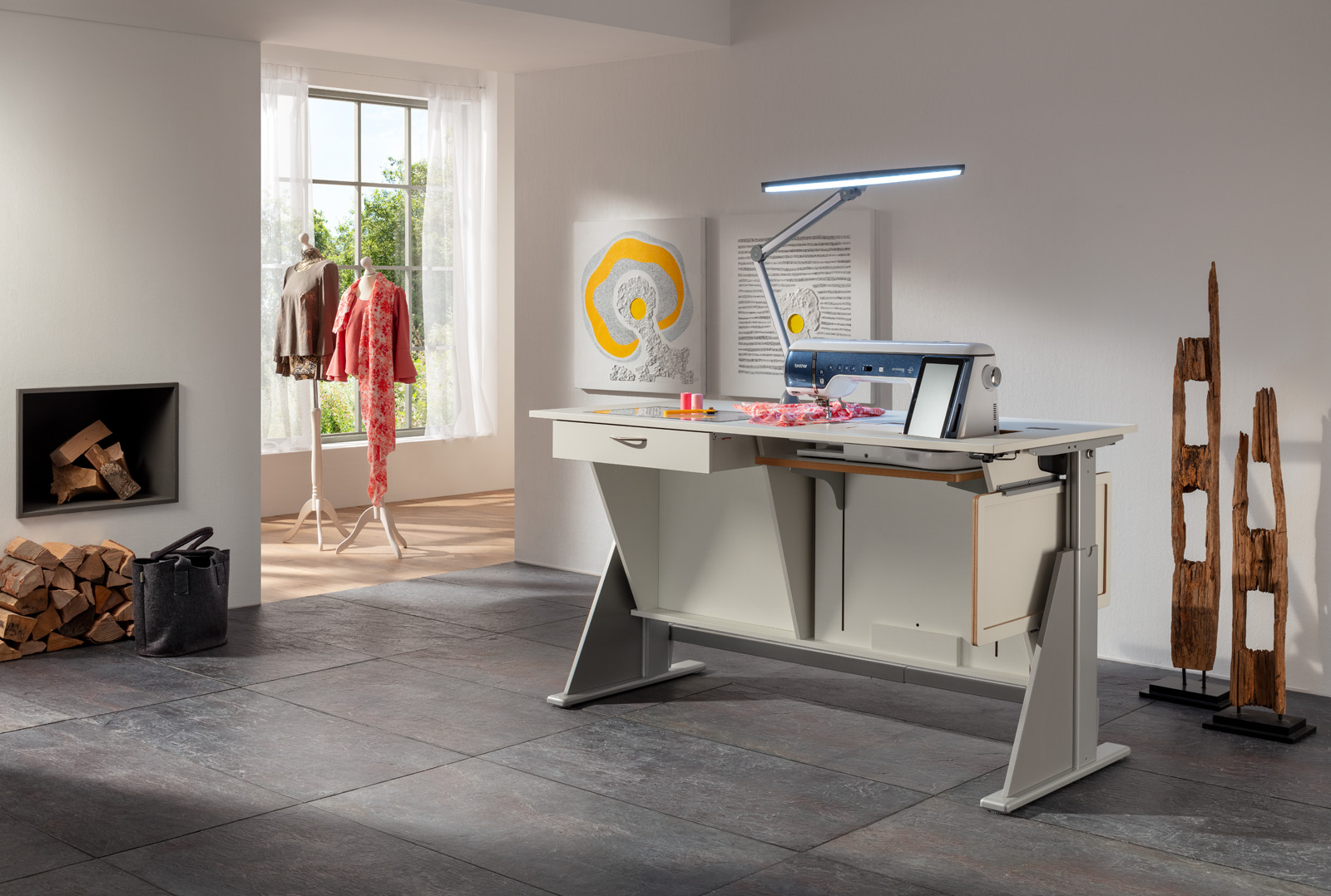 Featuring our infill Simply-6 cut-out, it can be used with any type of sewing machine including the Brother Aveneer EV1, Bernina 990 & Pfaff Creative Icon 2. An electronic Easy-Softtech Lift provides fast repositioning, and an i-Touch control panel with two memory functions and a lock button provides simple up and down movement. Furthermore, the table is equipped with a four-way power strip, allowing connection of the sewing machine and other electronics.