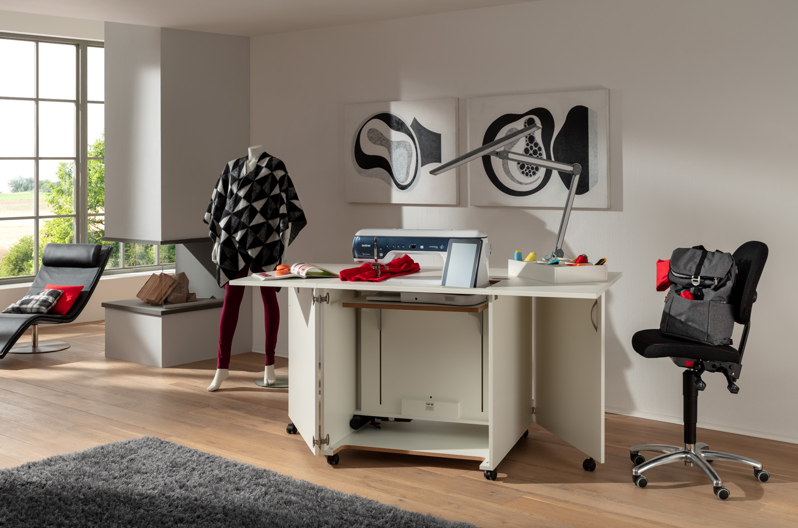 This highly versatile sewing table can also be used as a cutting table, as its height is adjustable between 770 to 1190 mm, reducing strain on the neck and back.